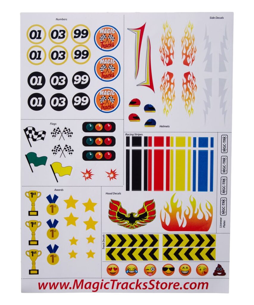 Комплекта Меджик Тракс включва една или две състезателни коли, 165 писта парчета и 78 стикер детайла, за да украсите както искате! Дължината на трасето е близо 3м.(11ft).