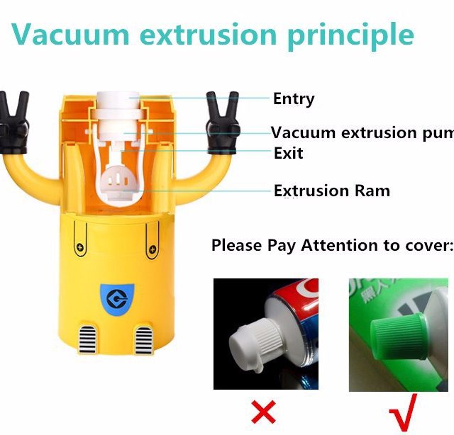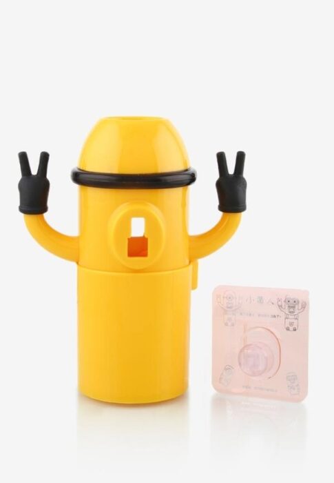 На пръв поглед виждате само един уред за баня, но всъщност са цели три: дозатор за паста, държач за 2 четки за зъби и чашка за вода, която се закрепя с дъното нагоре към главата на миньона и по този начин спомага за нейното по-лесно изсъхване.